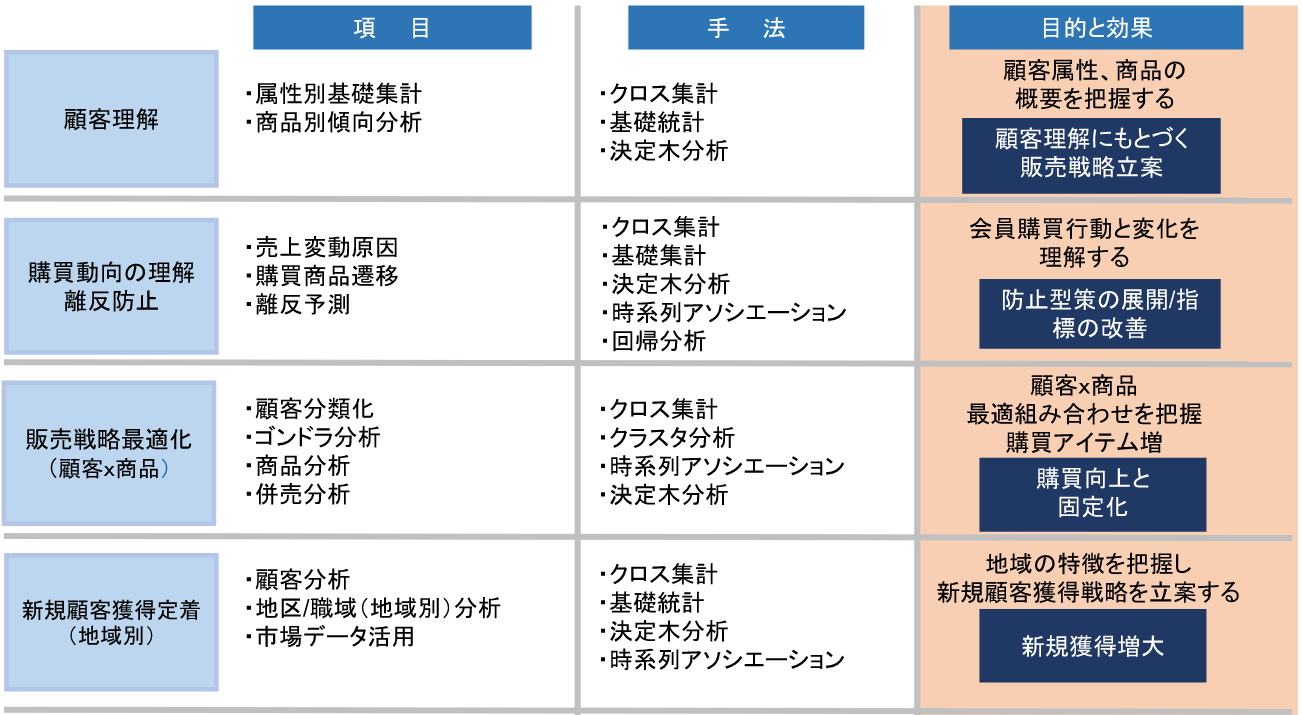 その後も分析実績を重ね、様々な角度から課題を見つけ出し、 そのときの課題に適したデータを抽出します。 |