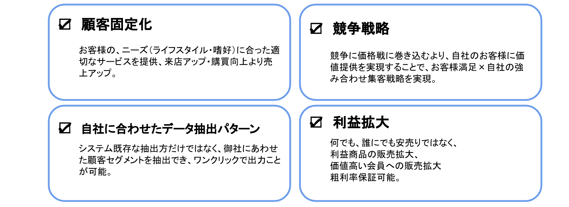 =お客様のニーズ×自社の強みを活かした施策をできず、顧客固定化が困難