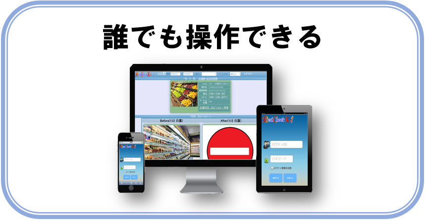 見やすく、使いやすいシンプルな画面と、PCの他にスマホ・タブレットにも 対応しているため店舗スタッフの負荷を軽減できます! |