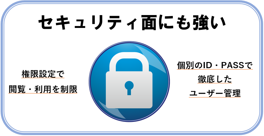 権限設定で閲覧・利用をユーザーごとに制限! 個別のID・パスワードで徹底したユーザー管理となっています。 |