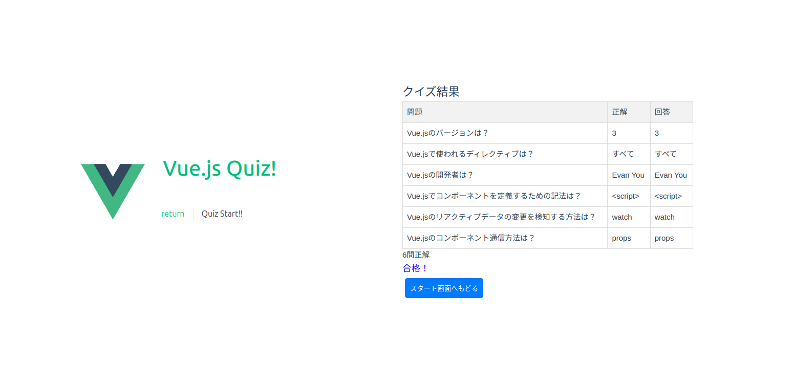 なので、問題はVue.jsについて記してあり凄くシンプルな構成ですが、複数の問題が出題されるようにしました。