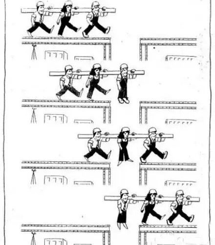 土木現場で3人の作業員が1本の木材を運んでいますね。